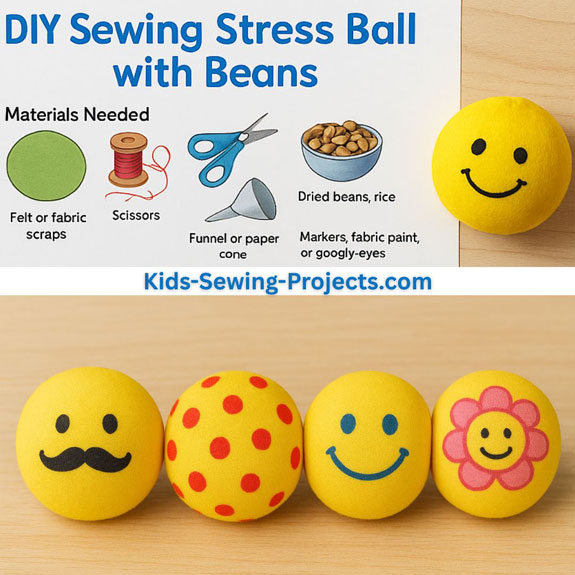 No-Sew Variation: Cut two felt circles. Glue around the edge, leaving a small gap. Fill, then glue the gap closed. Let dry fully before squeezing.