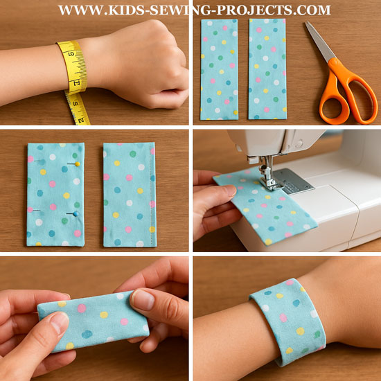 Finished!Kids can now wear their stylish new fabric bracelet or make more to give as gifts. This project teaches measuring, sewing straight lines, turning, topstitching, and basic closures—all important beginner sewing skills.